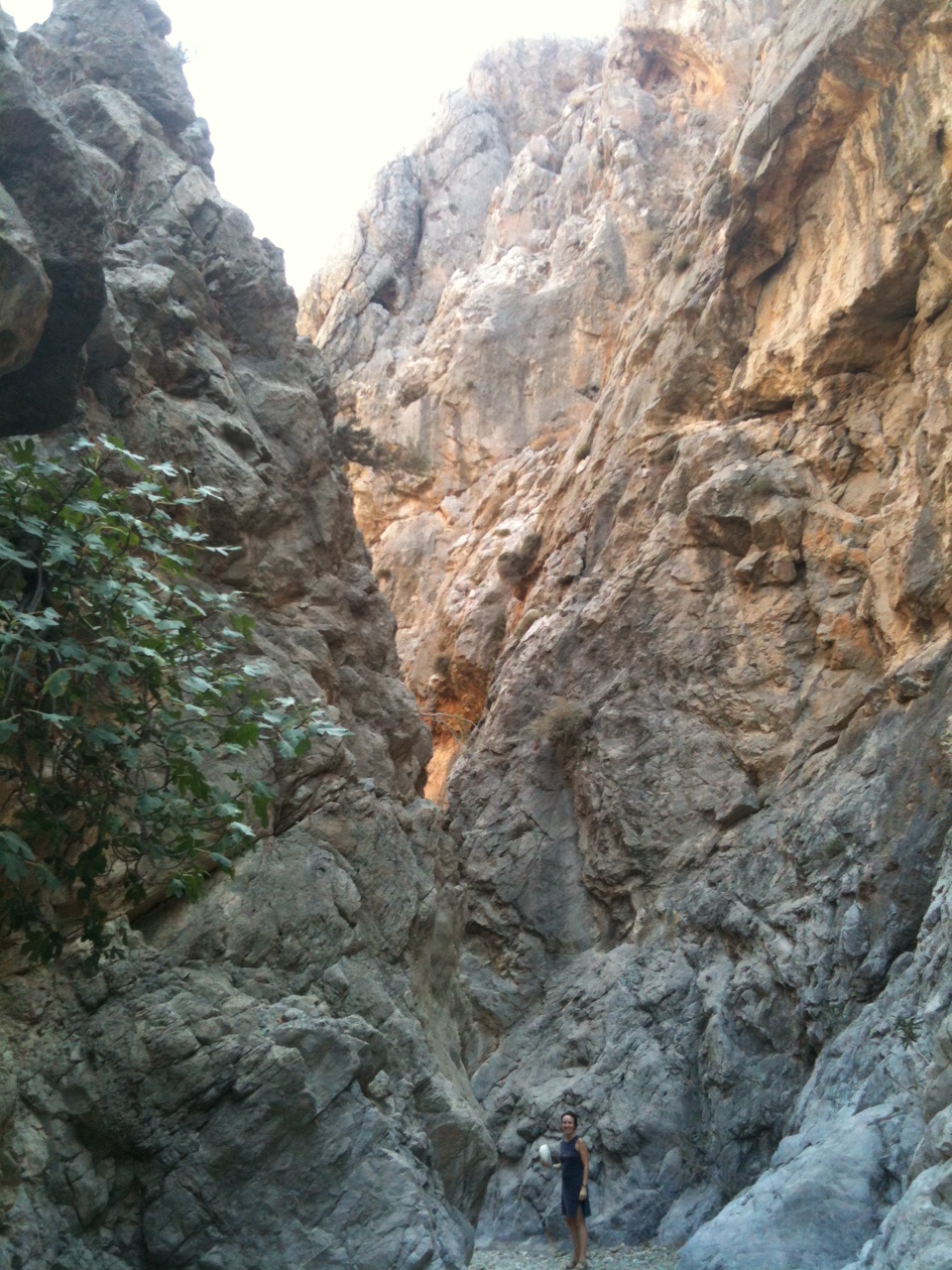 In cucina abbiamo fatto la pasta fresca, operazione che ho sempre adorato. Certo, un po’ stancante… In più considerate che, in quanto non molto esperta, procedo ad una velocità bradipale e capirete perché a mezzogiorno, ora del pranzo dello staff, abbiamo dovuto interrompere per riprendere subito dopo pranzo (e, a quel punto, inutile dirvi che era diventato un incubo). Però il risultato è stato soddisfacente, che poi è quello che conta, no? Dopo pranzo decidiamo di fare una gita a piedi. Per capire come un incantevole pomeriggio si sia potuto trasformare in un inferno dovete considerare che il sud di Creta ha una costa meravigliosa ma non sempre raggiungibile in auto. Anzi, i posti più belli sono infrattati e si devono letteralmente “conquistare” con lunghissime scarpinate. Aggiungeteci che sono l’anti-sport per eccellenza e tutto vi sarà immediatamente chiaro! Ciò nonostante (e con “ciò nonostante” intendo una marcia di circa tre ore totali tra andata e ritorno per fare un bagno di una mezzoretta), abbiamo attraversato territori selvaggi, rocciosi, brulli ma sempre diversi e spettacolari. Perfino due canyon (quella nella foto è Isa e sta lì proprio per fare intuire le proporzioni del paesaggio).